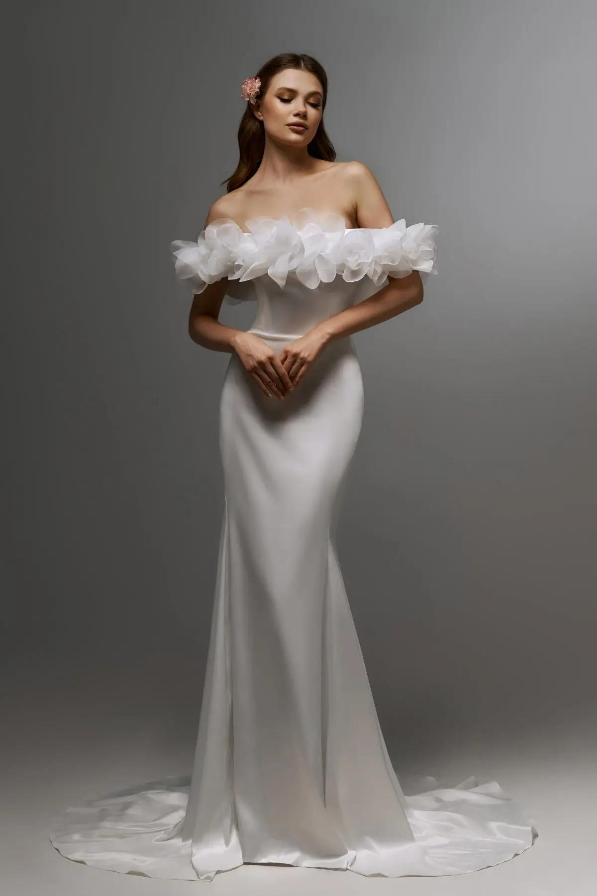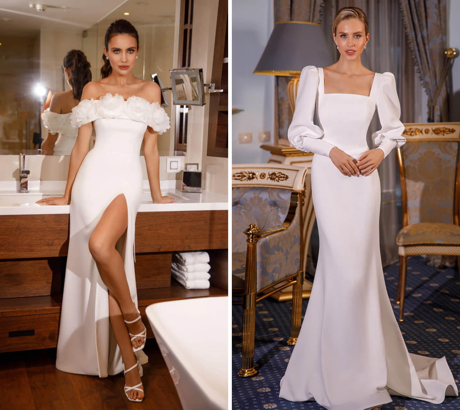 Для минималистичного образа подойдут платья из атласа или крепа. Они будут выглядеть элегантно, стильно и в то же время сдержанно. Здесь можно выбрать как совсем лаконичные модели, так и минимализм с деталями из цветов, бантов, съемных бретелей и т.п.